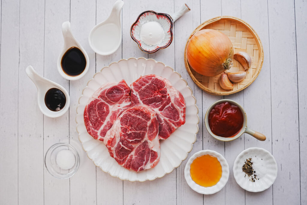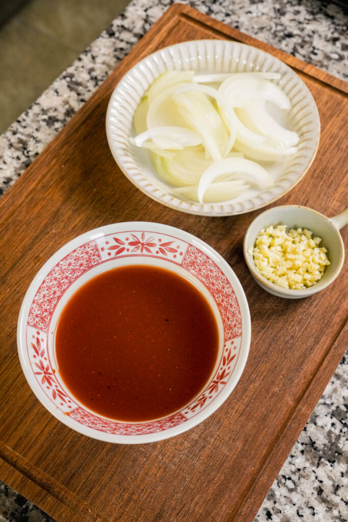 • Prepare the Sauce: while the pork marinates, mix ketchup, honey, soy sauce, black pepper, and water in a small bowl. Slice the onion and garlic.