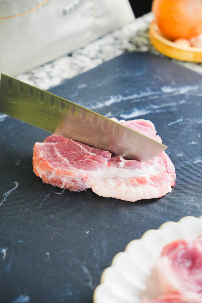 • Pound the pork shoulder using the back and side of a knife or a meat tenderizer until it flattens and feels looser. Lightly cut the membrane so the meat doesn’t curl up during frying.