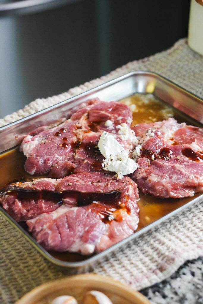 • 1 lb pork shoulder butt sliced horizontally (about 1-inch thick pieces)