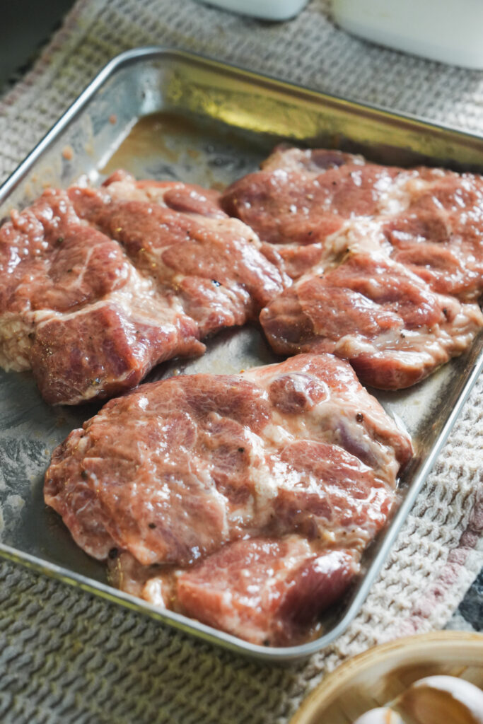 The secret to tender, juicy pork chops starts with choosing the right cut. I highly recommend using pork shoulder butt (梅花肉). It has the perfect balance of lean and fat, with even marbling that keeps the meat tender and bouncy after cooking.