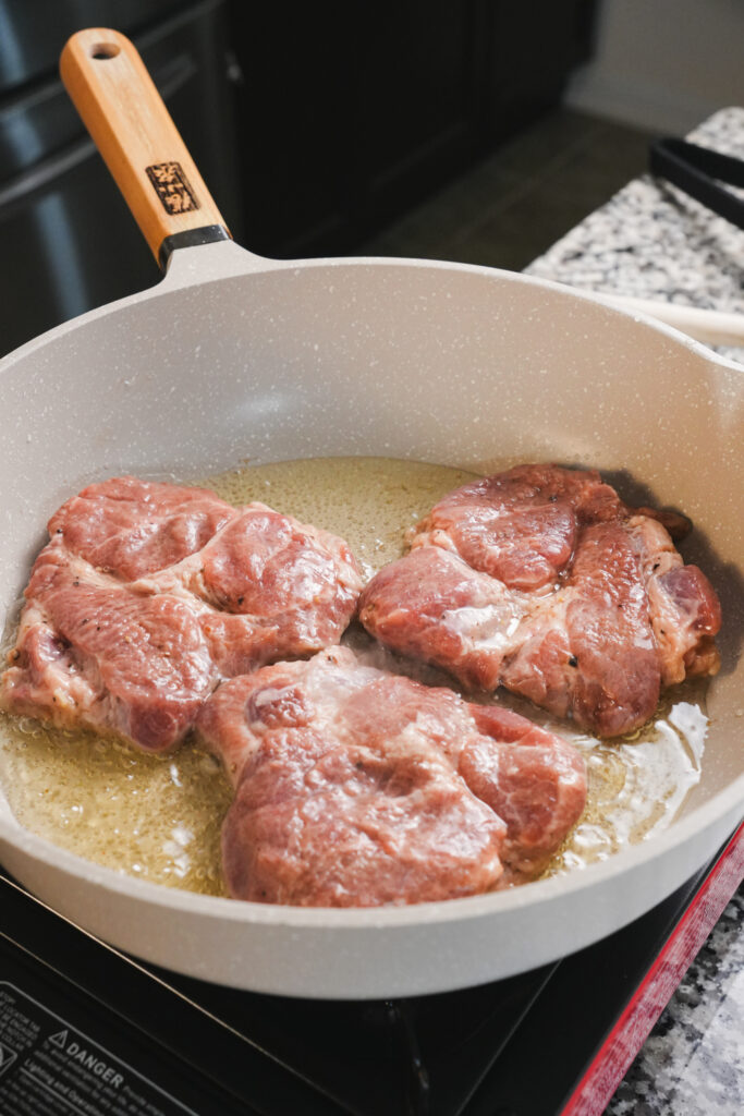 • Heat 2 tbsp oil in a pan over medium heat. Add the pork chops and gently press down with a spatula to ensure even browning. Pan-fry each side for about 4 minutes until golden brown. Remove and set aside.