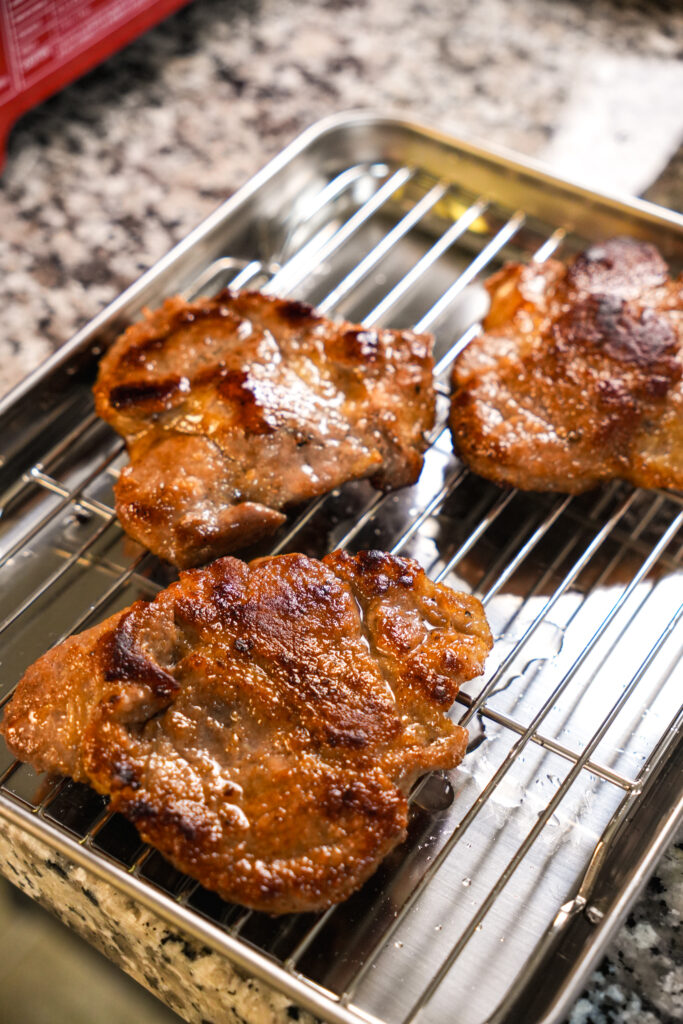 While pork loin is leaner, it tends to dry out easily when pan-fried, making it less ideal for this dish. Pork shoulder, on the other hand, stays moist and flavorful — exactly what you want in a Hong Kong-style pork chop.