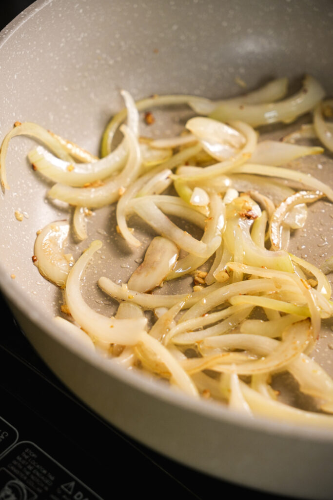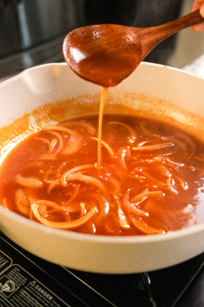 • Remove excess oil and burnt bits from the pan. Add a bit of fresh oil if needed, then sauté the onion and garlic for 2 minutes until fragrant and translucent. Pour in the sauce mixture, bring it to a boil, then lower the heat.