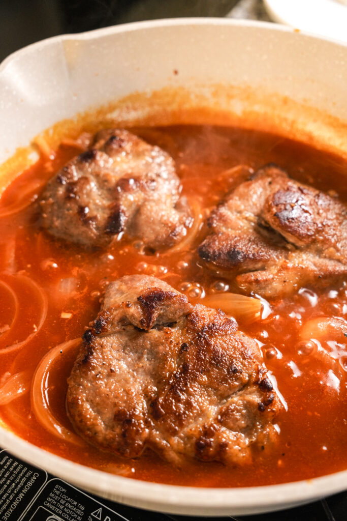 • Add the pork chops back into the pan, spooning sauce over each piece. If the pork chops are thicker, cover and simmer for a couple of minutes until fully cooked through.
