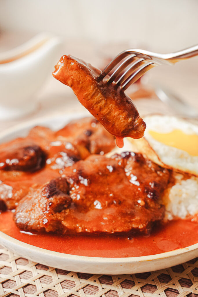 Seriously, this pork chop will make you inhale rice. It’s tender, juicy, and coated in a tangy onion-garlic ketchup sauce that’s too good to leave a single grain behind.