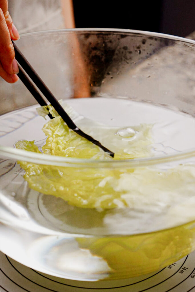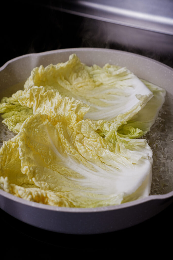 3. Prepare the cabbage: Cut off the bottom third of a Napa cabbage and separate the leaves. Wash thoroughly. For more pliable leaves, blanch them in boiling water with ½ tbsp salt for 30–60 seconds, then shock in cold water. Drain well.