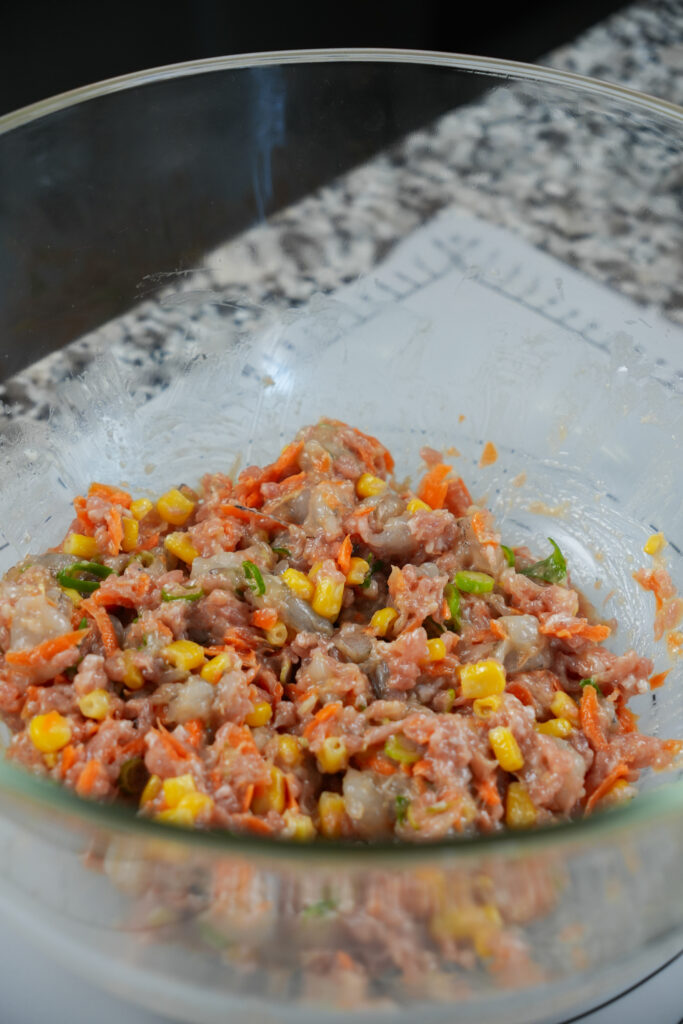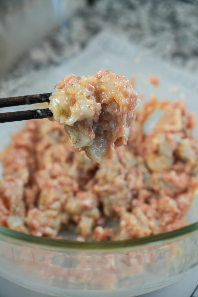 - Binding the filling: Mixing the pork and shrimp in one direction helps the proteins bind, giving the filling that bouncy, juicy texture similar to dumplings.