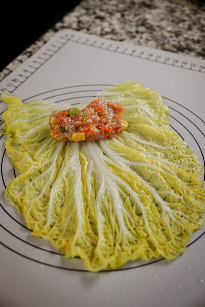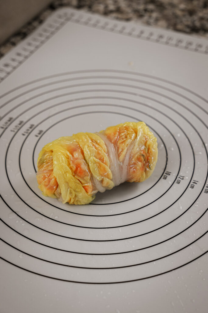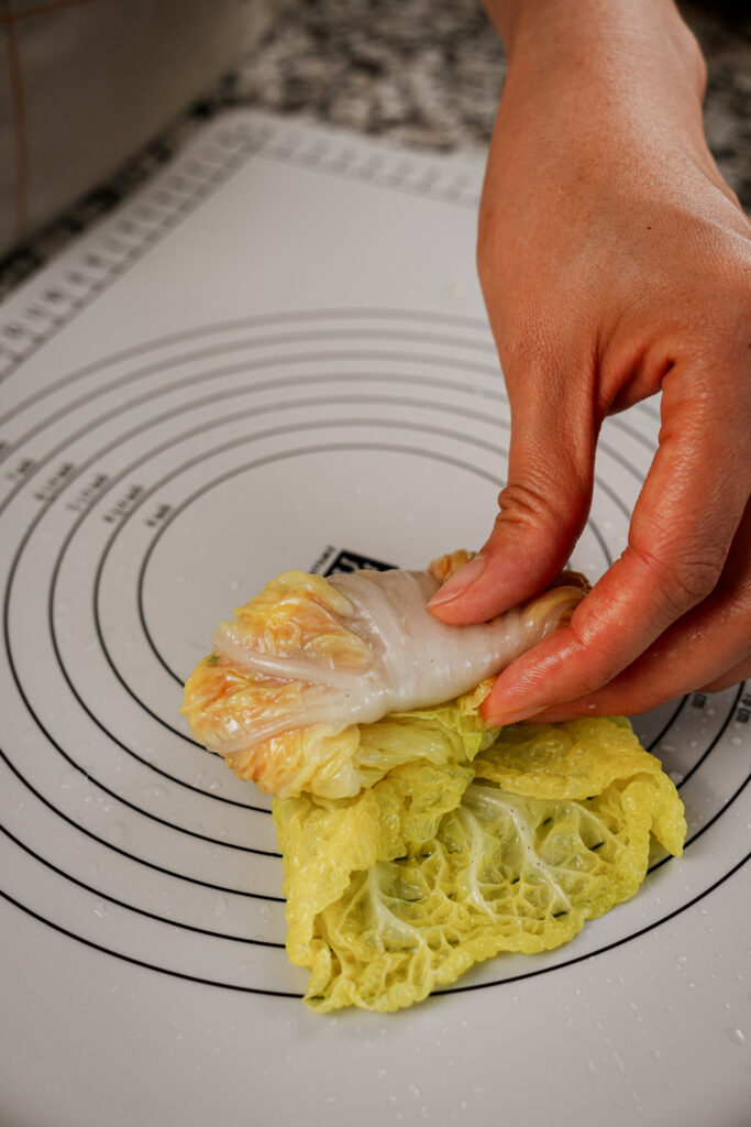 - Prepare the cabbage: Cut off the bottom third of a Napa cabbage and separate the leaves. Wash thoroughly. For more pliable leaves, blanch them in boiling water with ½ tbsp salt for 30–60 seconds, then shock in cold water. Drain well.