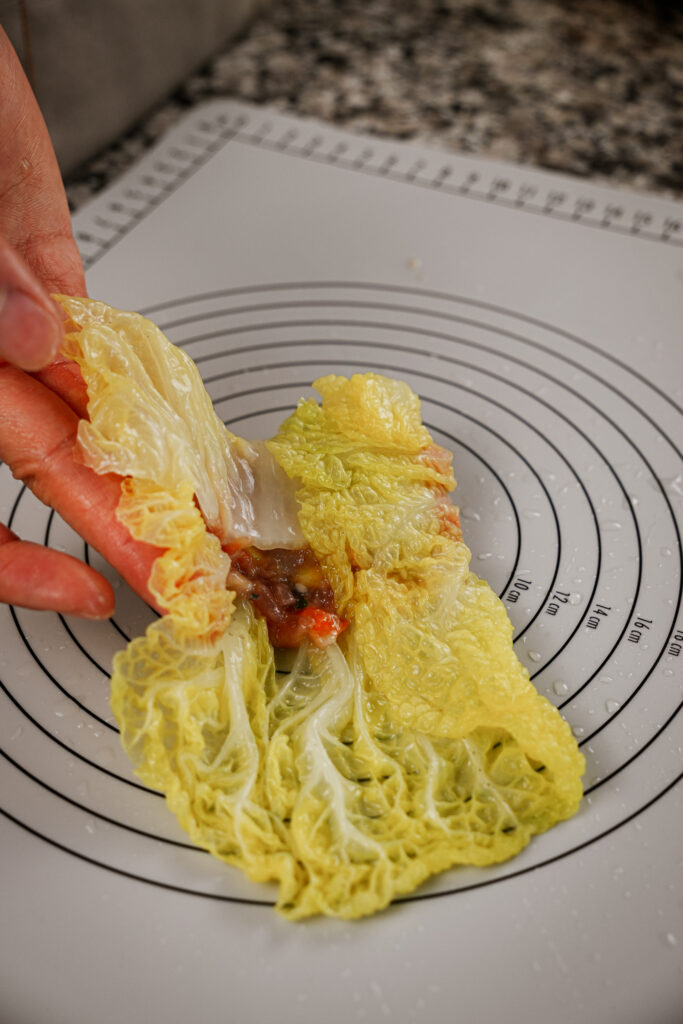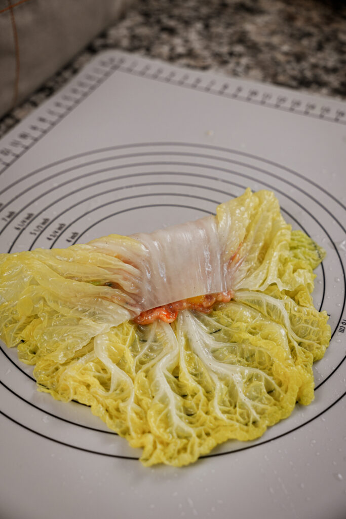- Wrap the rolls: Place a spoonful of filling at the base of each cabbage leaf. Roll once to cover the filling, fold in the sides, and continue rolling tightly, just like a spring roll. You should get about 12–15 rolls.