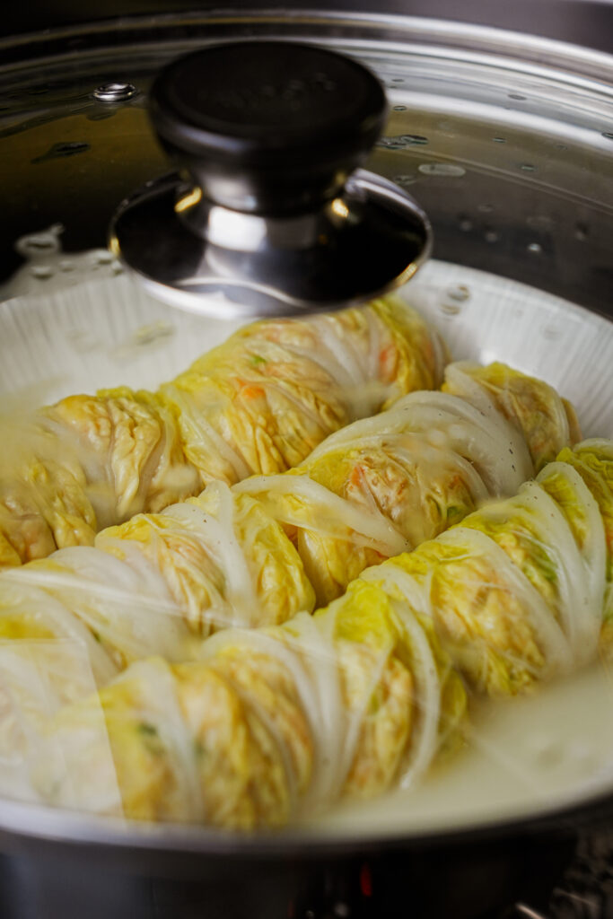 - Steam: Arrange the rolls on a plate in a single layer (or two at most). Steam over medium-high heat for about 10 minutes, then save the steaming liquid for the sauce.