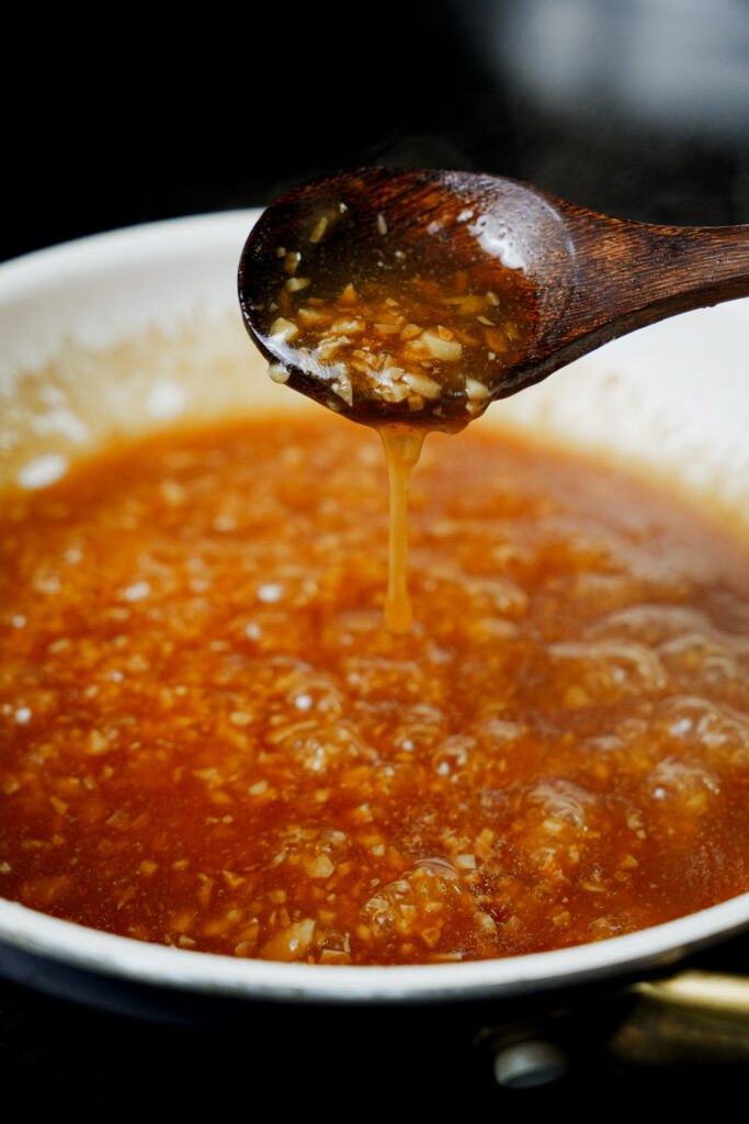 - Make the sauce: Heat oil in a small pan and sauté garlic until fragrant and lightly golden. Add soy sauce and oyster sauce. Mix cornstarch with the reserved steaming liquid (or water) and pour it in. Stir until the sauce thickens.