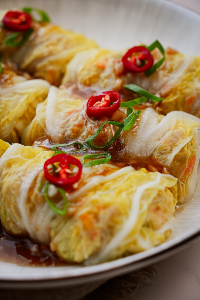 7. Finish & serve: Pour the sauce over the cabbage rolls. Garnish with chopped green onion or sliced Thai chili for a bit of heat. For an extra touch, drizzle with hot neutral oil to sizzle the sauce before serving.