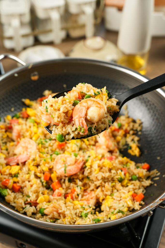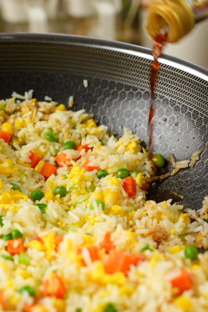 Why the wok wall? The sauce caramelizes against the hot surface before hitting the rice — that’s where the deep, savory wok flavor comes from.