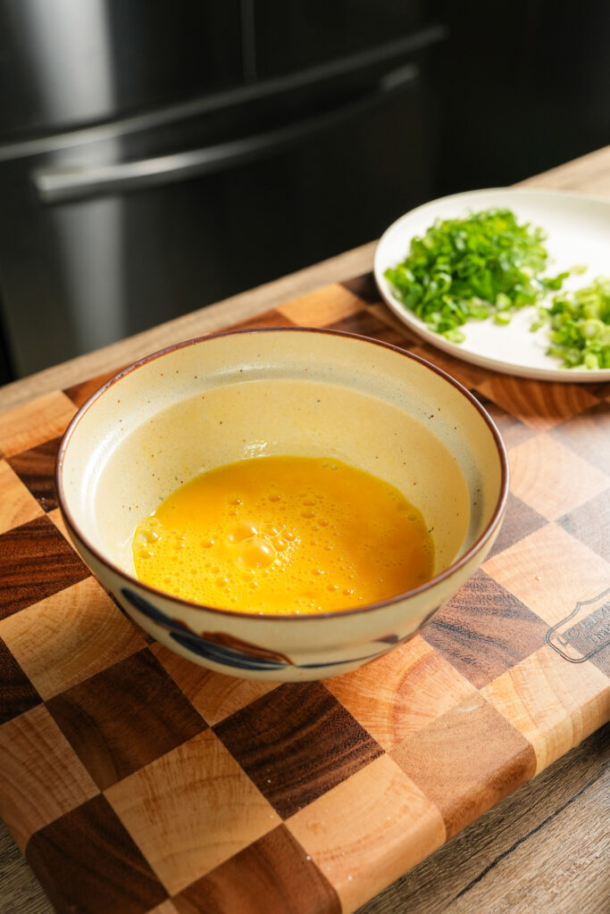 - Prep everything: Chop green onions and separate white and green parts. Blanch or microwave the vegetables with ⅓ cup water for 1 minute, then drain very well. Beat eggs with a pinch of salt.