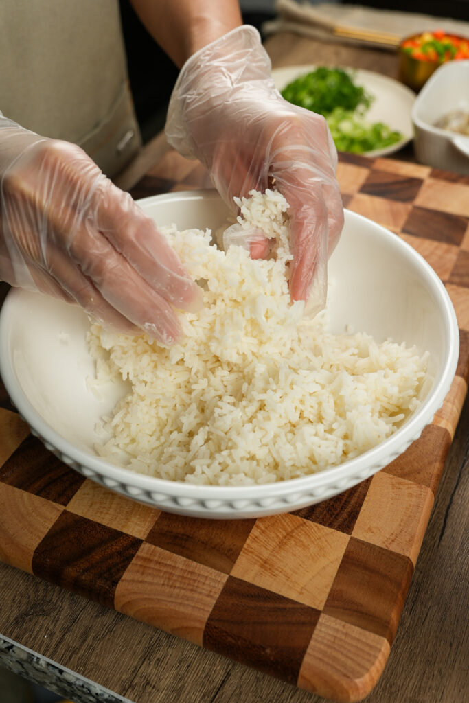 Break the rice into individual grains with your hands or a fork. If it still feels damp, toss with roughly ½ tbsp cornstarch to absorb the excess moisture.