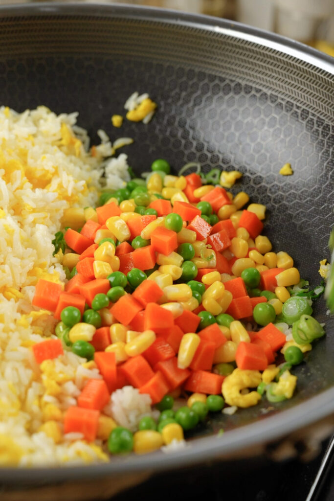 - Vegetables and seasoning: Push rice to one side. Add ½ tbsp oil, the white onion parts, and vegetables — stir-fry briefly, then combine with the rice. Pour soy sauce (and dark soy, if using) down the side of the hot wok, not onto the rice. Mix well, then add salt, white pepper, and bouillon or MSG. (Note 2)