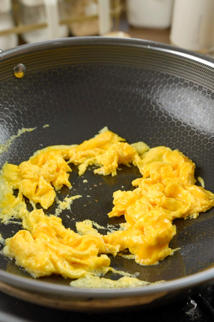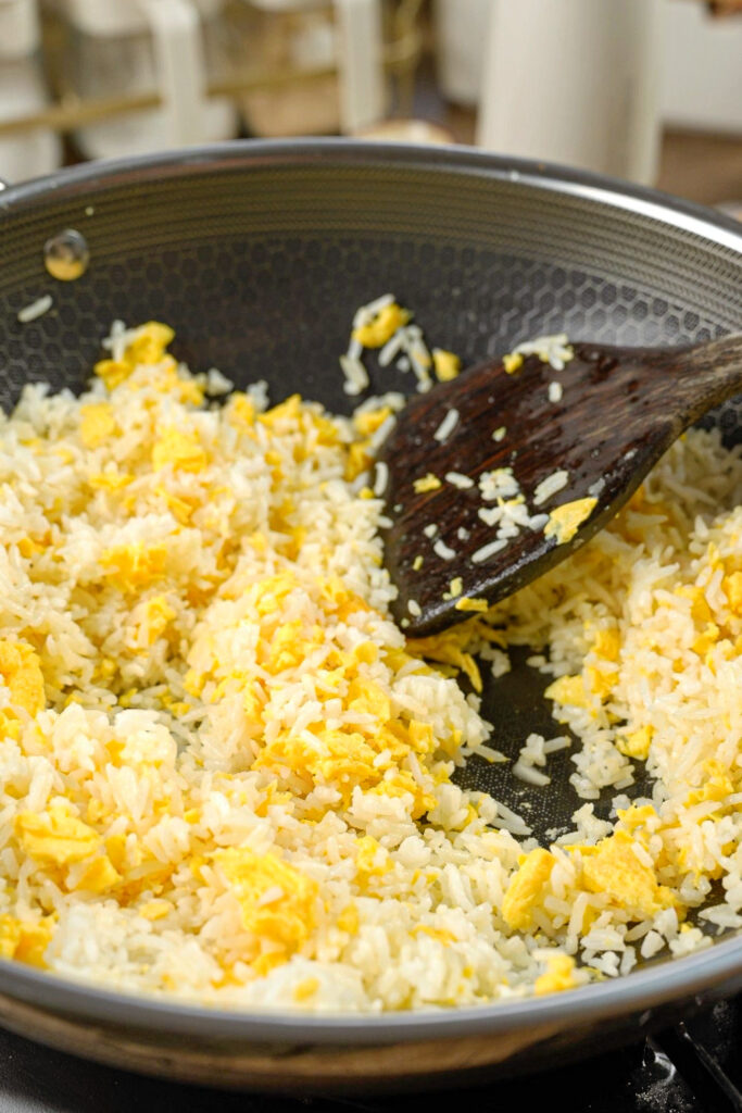 - Scramble eggs and add the rice: Add 1½ tbsp oil and pour in the eggs. Scramble into soft pieces, then add the rice before they fully set. Stir-fry together, breaking everything into individual grains.