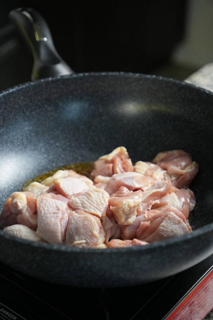 Cut chicken thighs into bite-sized pieces. Pat dry to remove excess moisture — this helps them brown better.