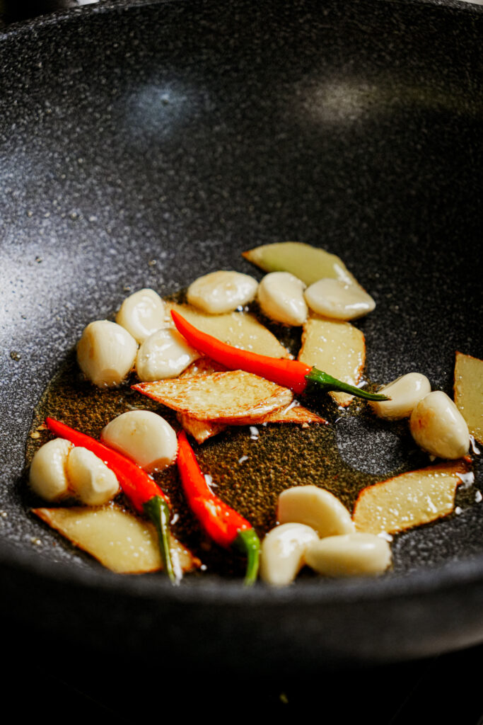 - Heat 3 tbsp roasted sesame oil over medium heat. Add the ginger first; pan-fry for about a minute until lightly browned. Then add garlic and Thai chilies.