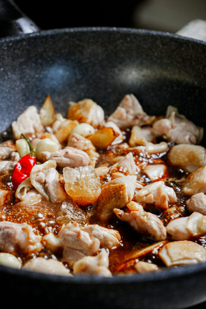 - Pour in 3 tbsp rice wine, light soy sauce, dark soy sauce, and rock sugar.