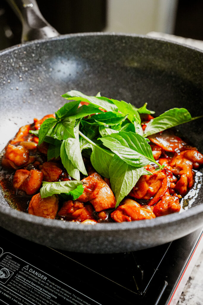 Sweeter and thicker thanks to rock sugar, reduced until the sauce clings to every piece of chicken. Thai basil is added right at the end, giving the dish its signature herbal aroma that balances the richness.