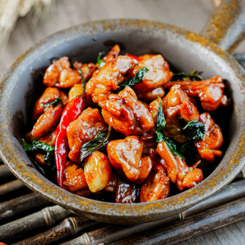 If you’ve ever had three cup chicken (San Bei Ji, 三杯鸡), you know why this dish is so beloved. Tender chicken simmered until coated in a glossy, savory-sweet sauce with the fragrance of sesame oil, ginger, garlic, and fresh Thai basil — it’s comforting, bold, and surprisingly simple to make at home in just one pot.