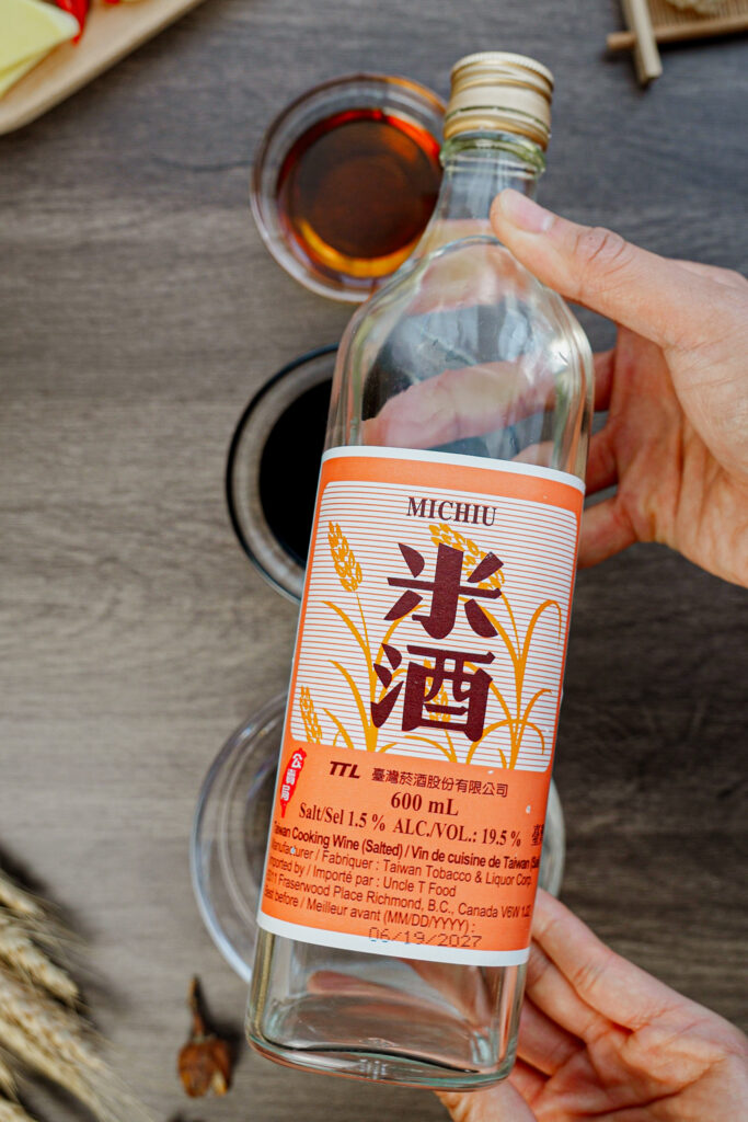 This dish uses clear rice wine called Mijiu (米酒). It’s mild, slightly sweet, and essential for the authentic flavor and light color of the sauce.