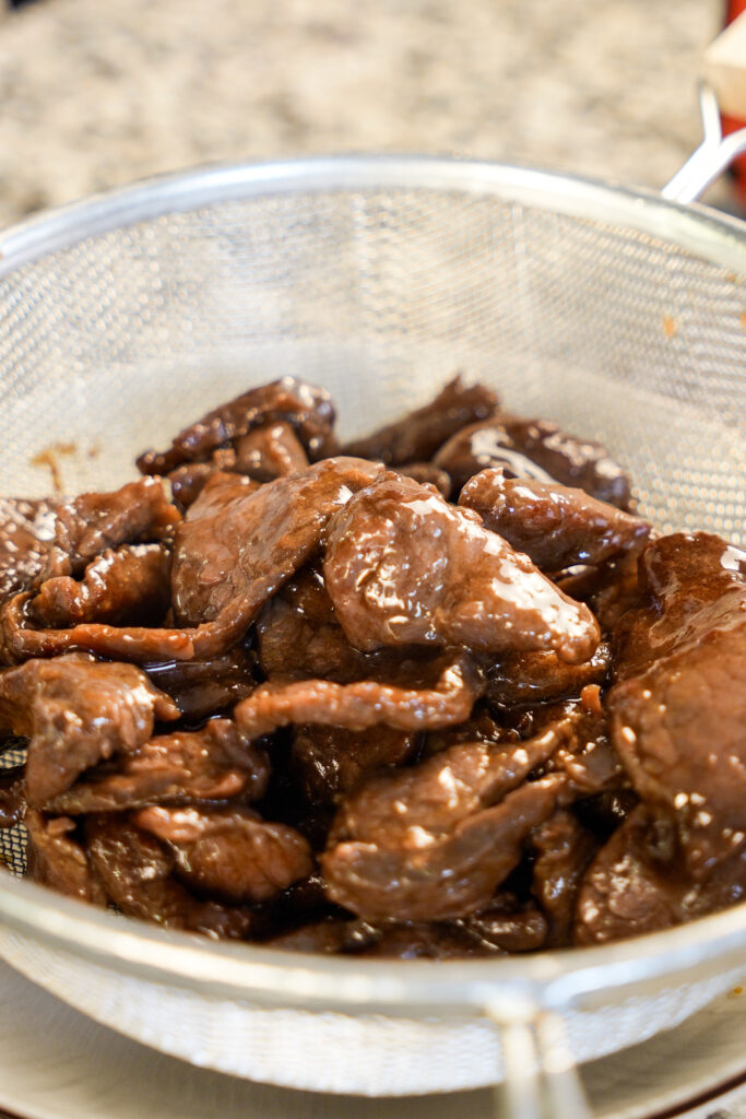 - Marinate the Beef: Slice the beef against the grain into thin, bite-sized pieces (about 1/4 inch thick). In a bowl, mix in the baking soda if using and let sit for 15 minutes. Rinse, pat dry, and then add soy sauce, dark soy sauce, oyster sauce, cornstarch, and water. Mix very well until the beef absorbs all the liquid. Add oil at the end to seal in the moisture. Let the beef marinate in the fridge for at least 15–20 minutes.