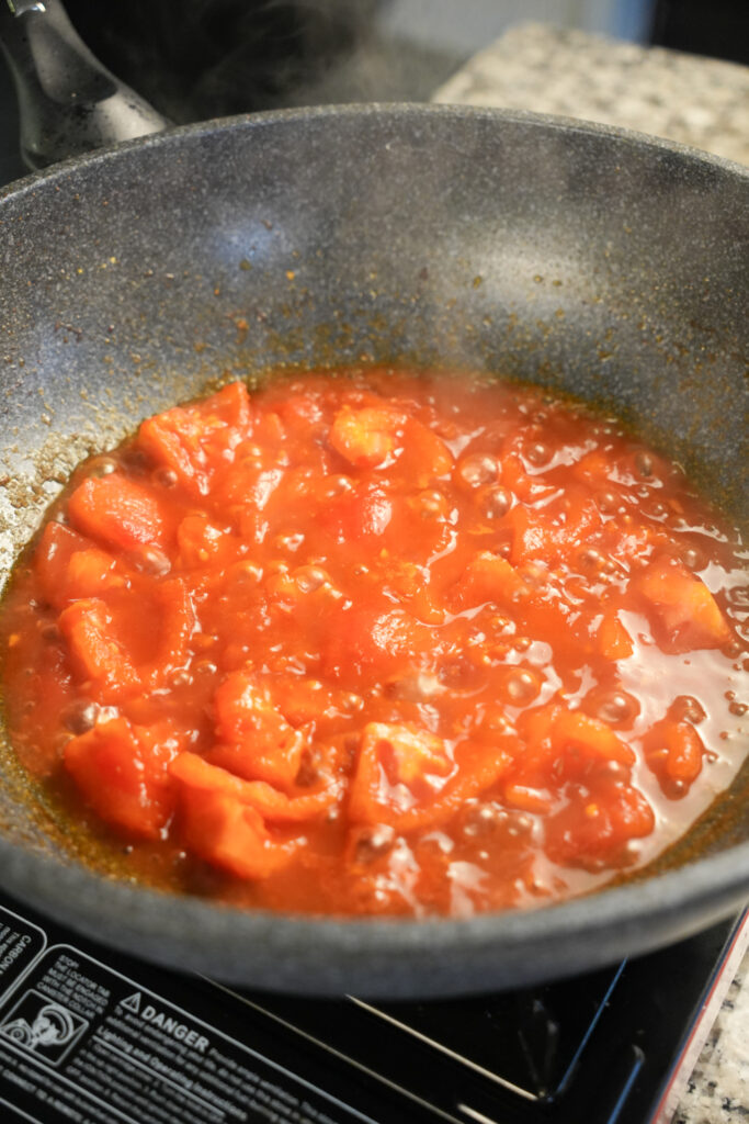 - Make the Tomato Sauce: Using the remaining oil in the pan (add more if needed), sauté the chopped tomatoes. Add ketchup, soy sauce, salt, and water. Let everything simmer until the tomatoes soften and start to break down.