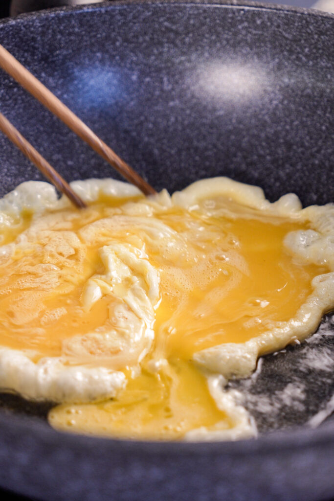 - Cook the Egg: Heat about 2 tablespoons of oil in a nonstick pan over medium heat. Once the oil reaches around 220°F, pour in the egg. It should gently bubble without setting too quickly. Stir softly until just set. Avoid overcooking—runny eggs will make the sauce cloudy later. Remove and set aside.
